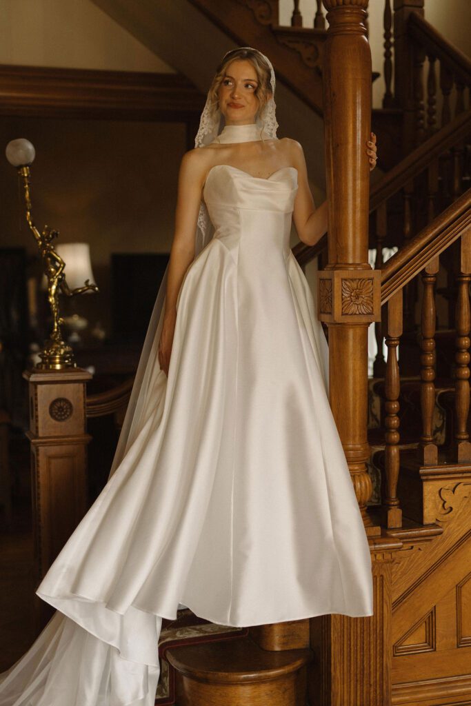 Stella came in wanting a wedding dress that was classic + timeless and fit her vintage wedding inspo. We knew “Romina” by Jenny Yoo would be the perfect fit! Plus, we paired it with a gorgeous satin scarf that completed her wedding look!